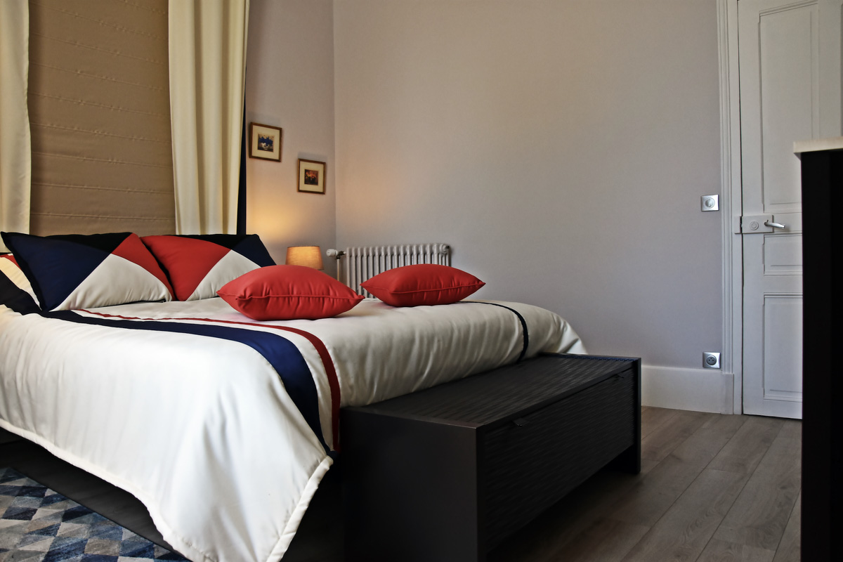 Dormitorul matrimonial are si o camera de dressing. Aproape tot mobilierul a fost proiectat de noi si executat la Bucuresti. Am fost onorati sa primim aprecieri de la executanti francezi, de la mesteri locali si bineinteles, de la beneficiari, pentru calitatea serviciilor romanesti. Mobilierul personalizat si la comanda a fost implementat ireprosabil. Intreaga locuinta a devenit mult mai functionala si a fost amenajata intr-un limbaj de texturi si culori actual, modern, dar cu grija pentru o ambianta placuta, confortabila.